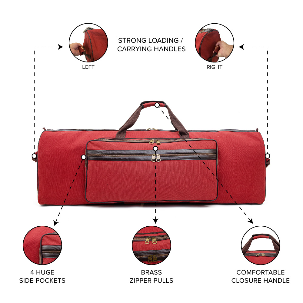 The bags are made from industrial strength, heavy duty canvas and feature zip pockets, end snap pockets, shoulder strap and reinforced, rubberized bottoms.